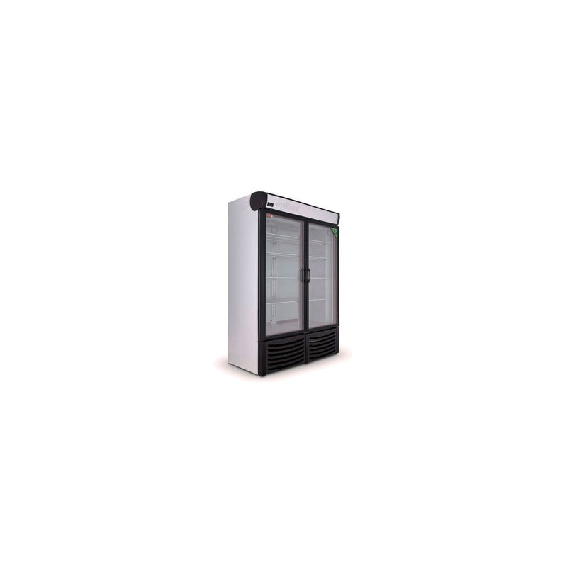 Refrigerador con doble puerta de cristal con capacidad de 36 pies3, fabricado en lámina con acabado blanco, parrillas de acero inoxidable e iluminación interior LED de alta intensidad.
